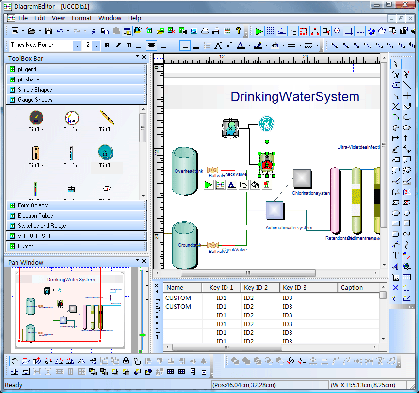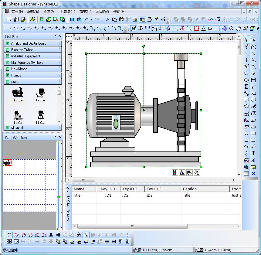 E-Form++提供了专门的界面设计工具DiagramEditor,在此工具中,我们可以轻松的应用通过上面的ShapeDesigner设计的各种煤炭监控系统元件来搭建图形界面。在搭建界面时,根据需要我们可以为特定的元件指定相应的Key
