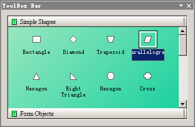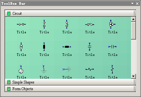 E-Form++可视化图形组件库支持提供了一个工具盒,在这个工具盒中,您可以根据您自己的应用程序的需要,放置任何您想要的图形或者关联数据,缺省情况下,这个工具盒放置了基本图形和复合图形两种组件,所有这些图形都可以定制,同时您也可以根据自己的需要来增加或者删除工具盒的页面,如下: