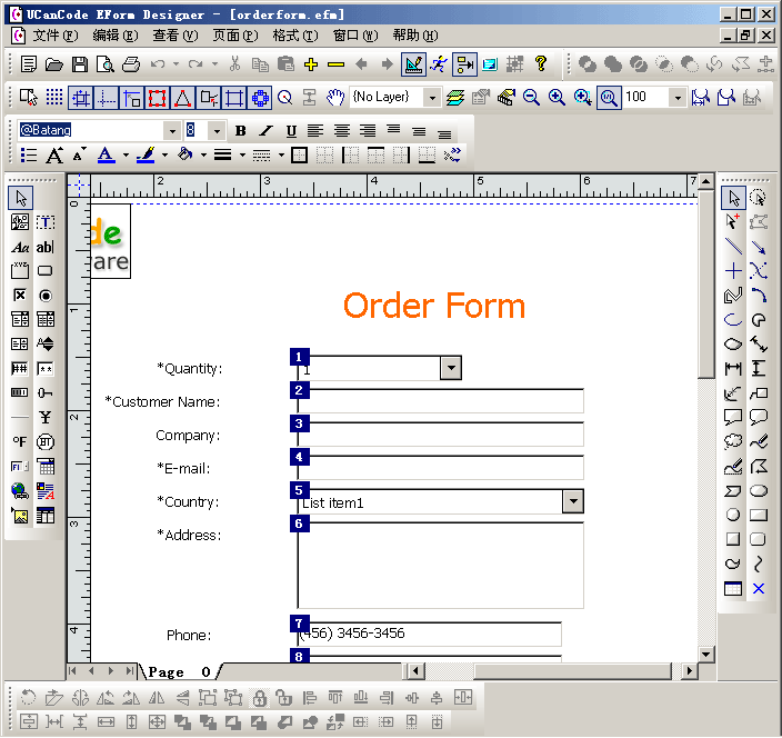 同时考虑到在开发电子表单类似系统的时候,我们需要调整画布上控件的顺序为,E-Form++可视化图形组件库还设定了Tab Order编辑模式,如下图(按 Ctrl+ D)切换: