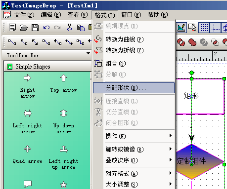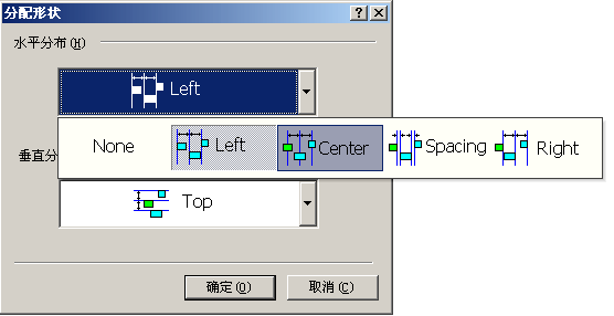 E-Form++可视化图形组件库包含了同Micrsoft Visio 2003完全一致的对象分布功能,这个功能允许您在水平方向和垂直方向上重新排布画布上的图形,菜单如下图: