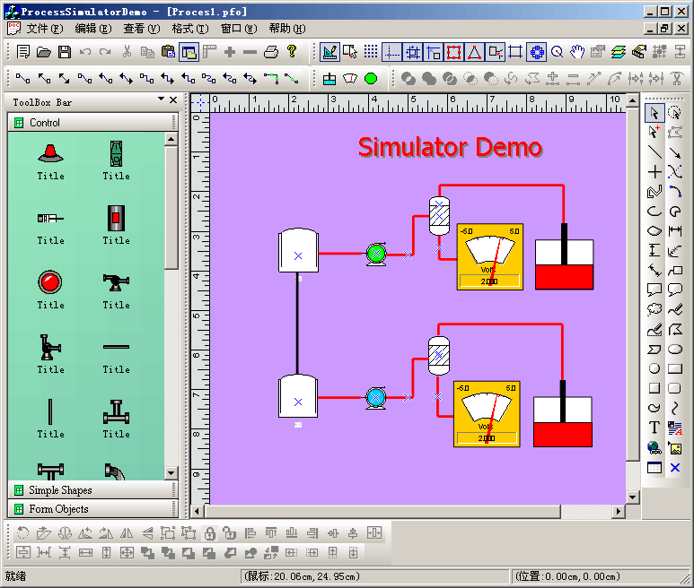 这个示例展示了如何使用E-Form++可视化图形组件库开发工控方面的应用,这个示例包含了三个能够独立运转的控件,包括:泵机,测量表和活塞,E-Form++可视化图形组件库支持简单而精确的定时器控制功能,可以根据需要创建其他工控组件.如下图: