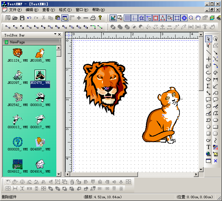这个示例展示了如何使用E-Form++可视化图形组件库开发从一个指定EMF文件夹中装载全部EMF文件,然后显示所有这些文件到工具盒中,并且支持通过拖拉的方式将其拖入画布中,如下图: