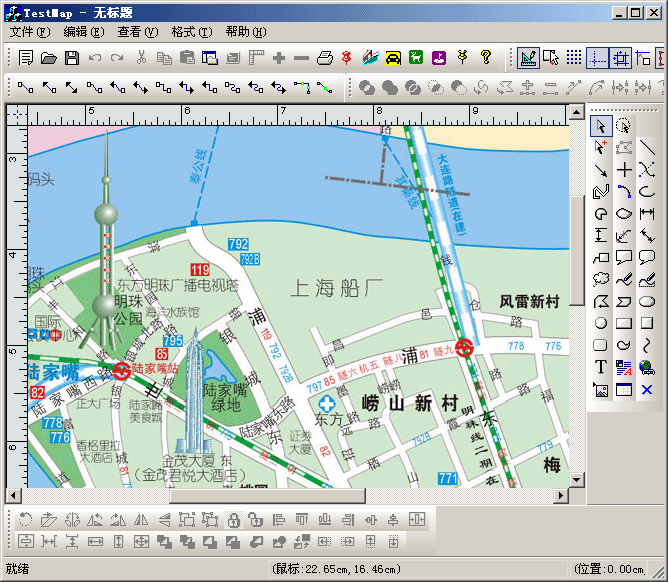 2、E-Form++画布的显示和数据处理全部由对象CFOBackShape来定义,这个对象被设计为即插即用的方式,让您可以轻松的设计自己的新的画布,然后用此画布作为自己应用程序的新的画布。例如,在画布的背景中显示一个地图,然后在上面编辑: