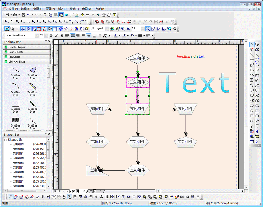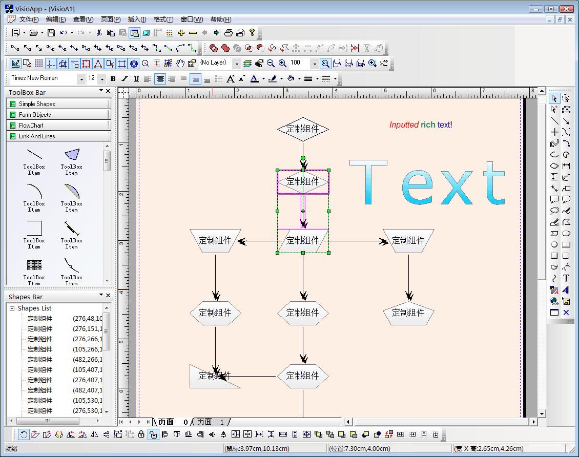 使用E-Form++可视化图形组件库开发类似于Visio的流程图、矢量图编辑应用是从E-Form++诞生之日起就一直处于非常重要的地位,我们将其作为E-Form++可视化图形组件库的头号解决方案来展开设计。很高兴的是,现在已经大功告成,您会发现,E-Form++此部分功能已经能够与当今世界最专业的图形编辑程序媲美,例如:Visio,