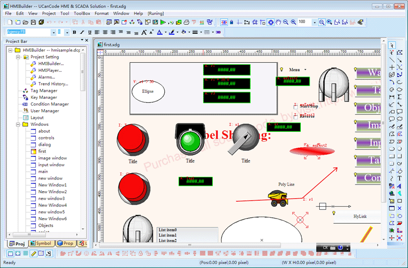 1)、HMIBuilder组态开发平台 (注意:HMIBuilder源代码只在高级企业版本1提供,纯WinCE版本只提供exe运行程序):具备完整的组态开发平台,可以制作动画,表达式,脚本等。