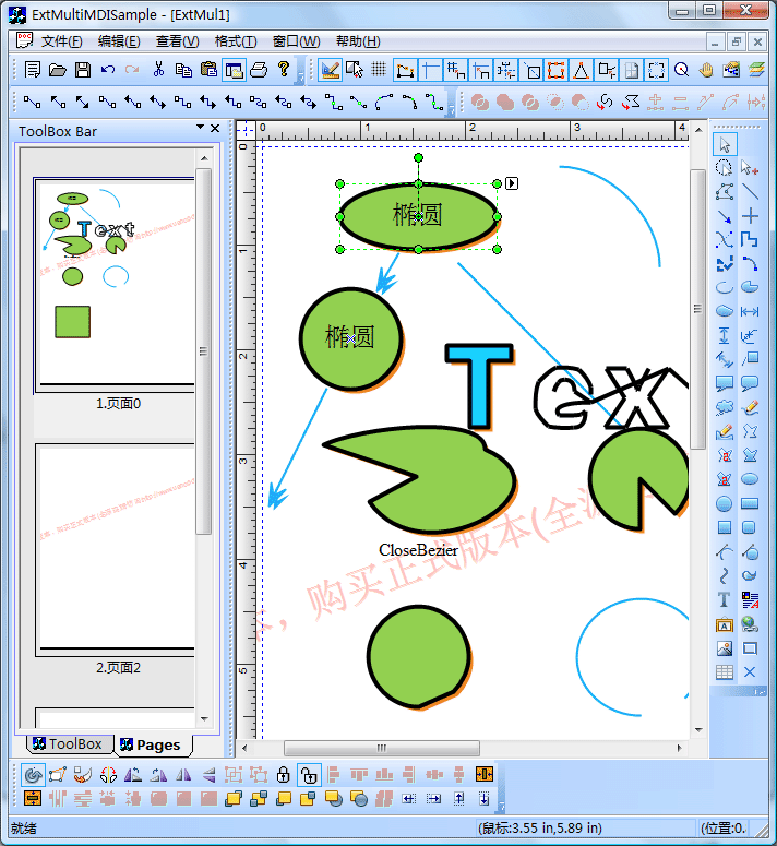 三、类似于Visio的Tab应用程序示例(示例程序VisioApp),此类应用程序风格非常类似于Microsoft的Visio应用程序,在窗口的最下面是页面列表,同一个文档由多个页面构成,用户可以根据需要添加或者删除页面: