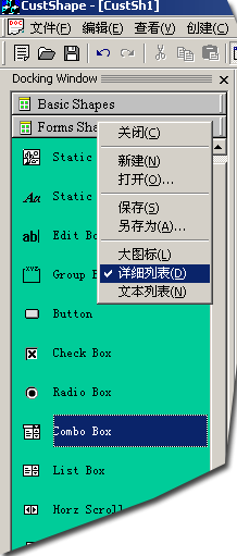 新增基于窗体的组件类CFOWndControlShape,用户可以轻松的将各种标准的Windows窗体组件(如列表框、编辑框、按钮、组合框、表格等)直接添加到Form++的画布上。参考示例程序CustShape所示: